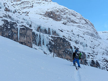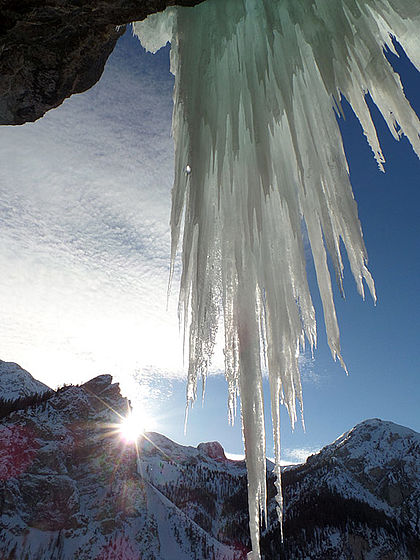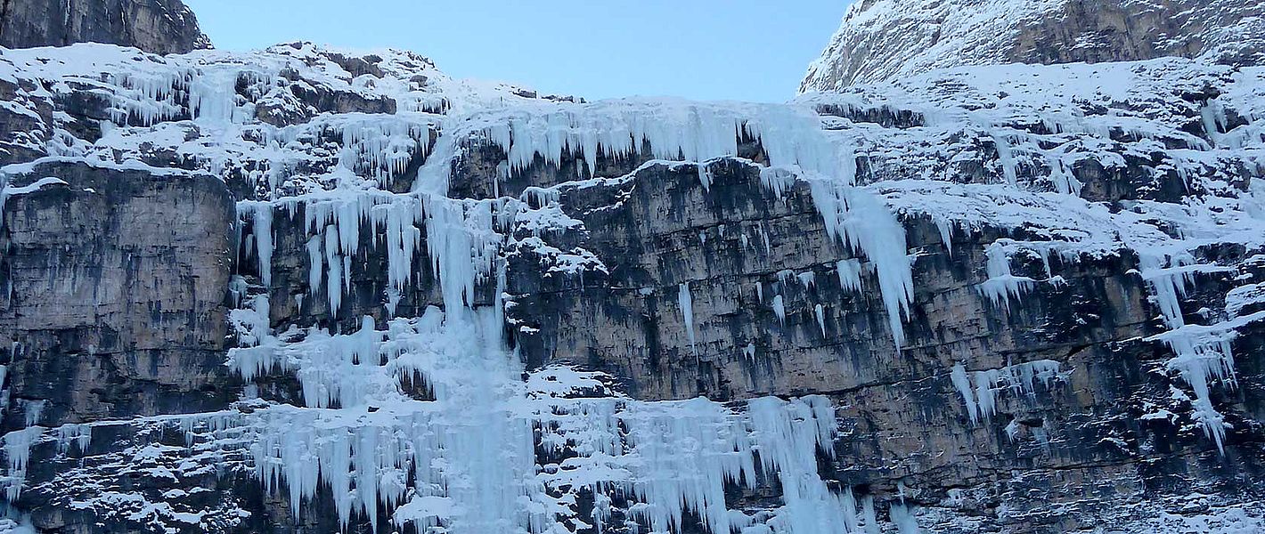 In the Dolomites you climb on the foot of large, vertical walls, often also in drains and chimneys, which finally lead to bands and high plateaus with enchanting views. The Dolomites are a huge region, which could be subdivided. For example, a weekly programme alone in Reintal “valley”, Corvara, , Corvara or Sottoguda would be a good idea. However, should you not be focused on one specific destination, many areas can be reached quite fast from the Pustertal valley. In any case a must for every ice climber!